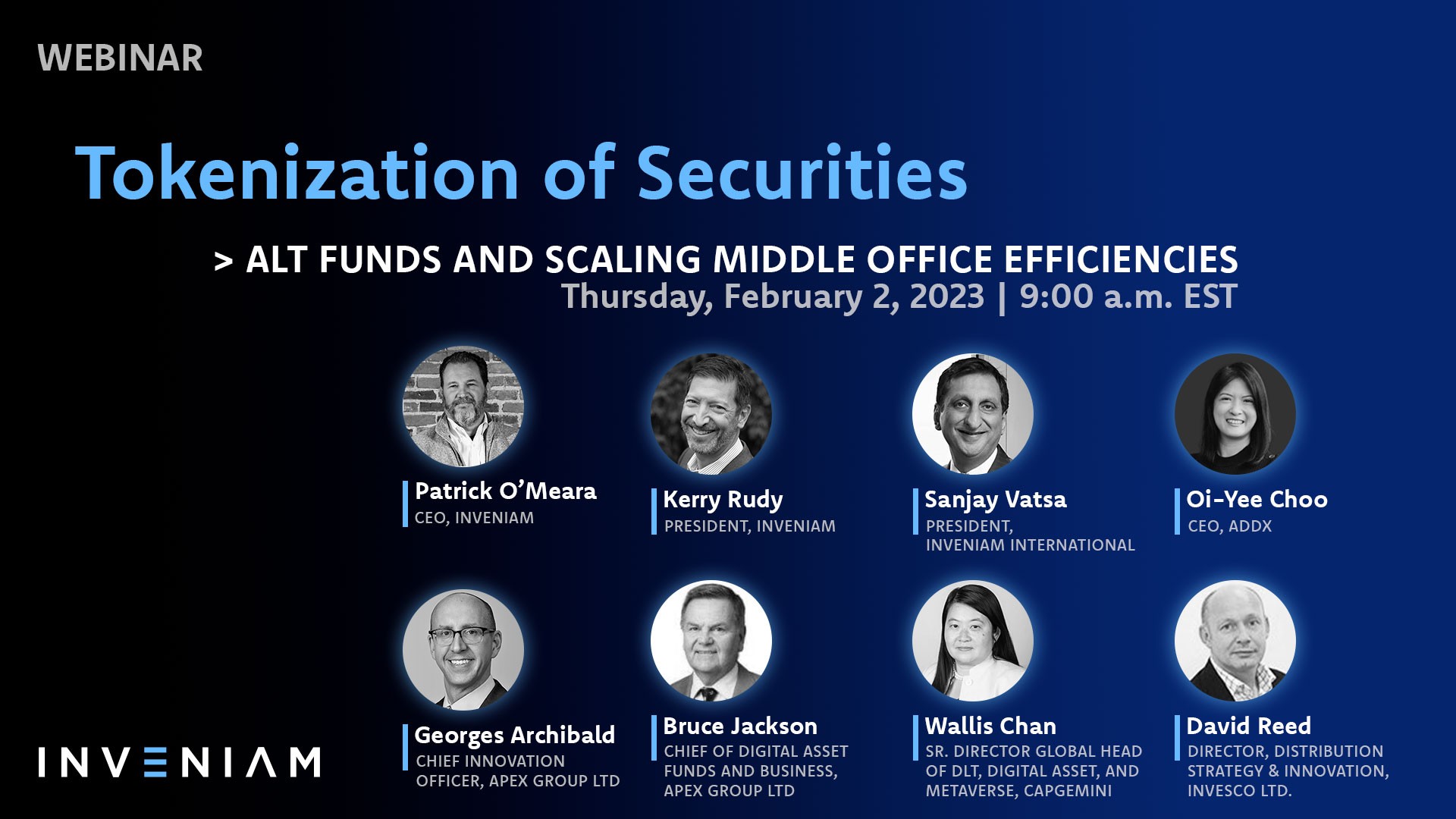 In the first webinar in a series focusing on the Tokenization of Securities, three members of the Inveniam team are joined by Richard Walker, Partner at Bain & Company to discuss tokenization with a focus on private assets. Joining Mr. Walker are Inveniam CEO, Pat O’Meara, Inveniam President, Kerry Rudy, and Todd Stevens, Global Head of Capital Markets at Inveniam.